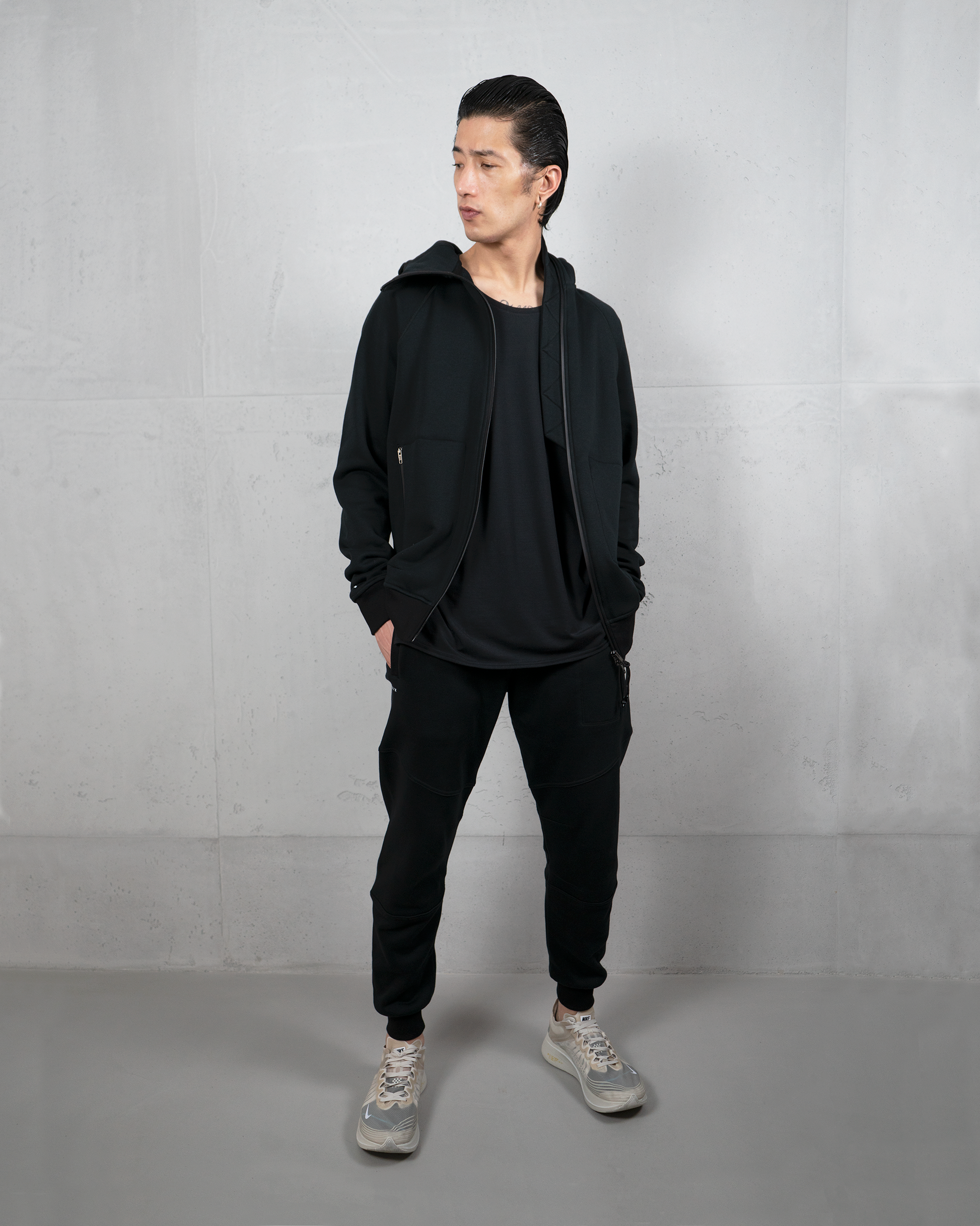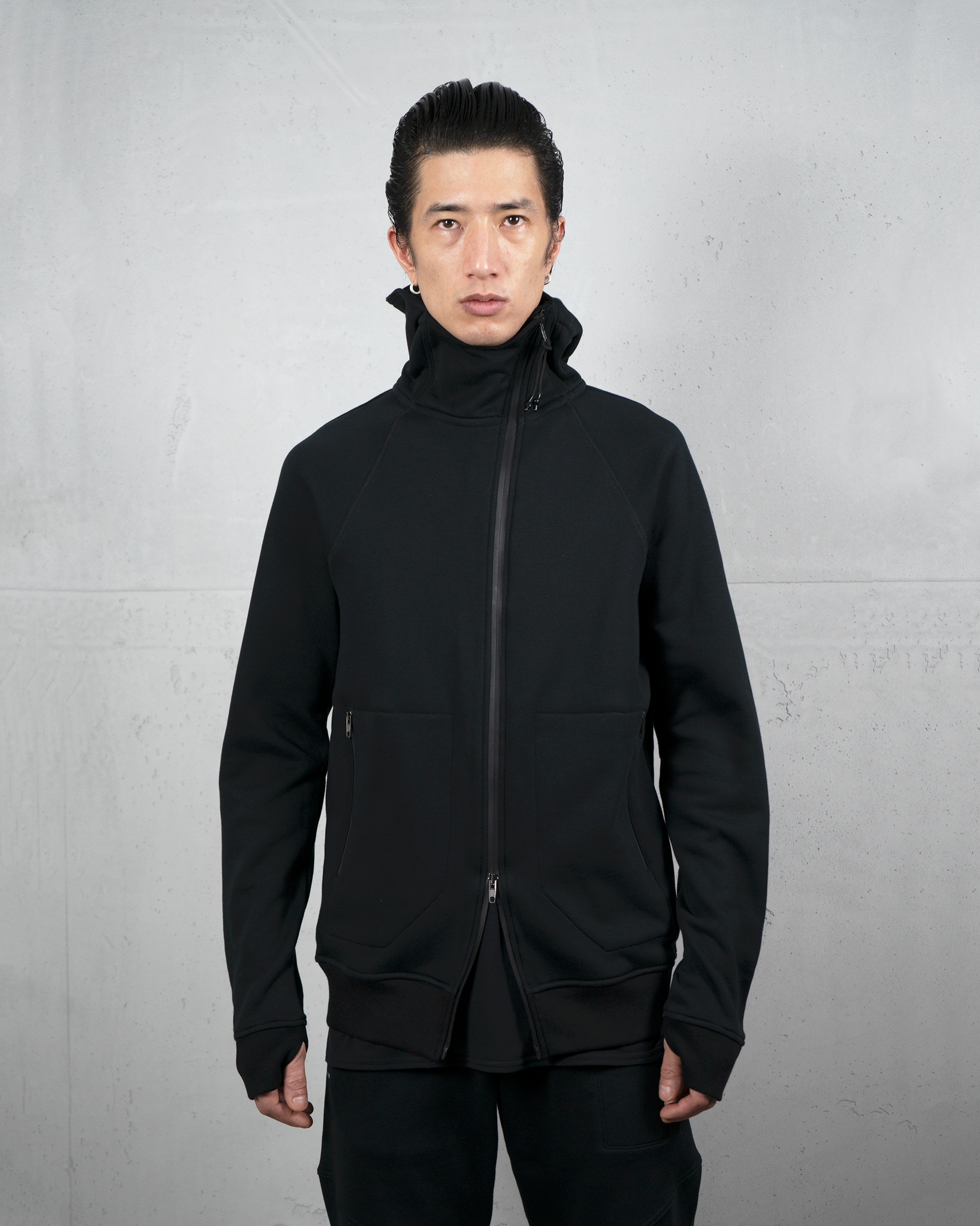 Windshield neck with shaped zipper, cuff with thumbhole, adjustable hood, water repellent zippers, front pockets